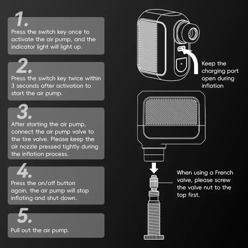2.Durante o processo de inflação, pressione a bomba de ar no bocal de ar com a mão.Se você ouvir vazamento de ar, ajuste a postura ou o ângulo de pressão até que não haja som de vazamento de ar.
